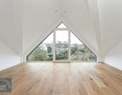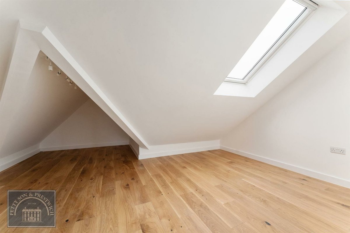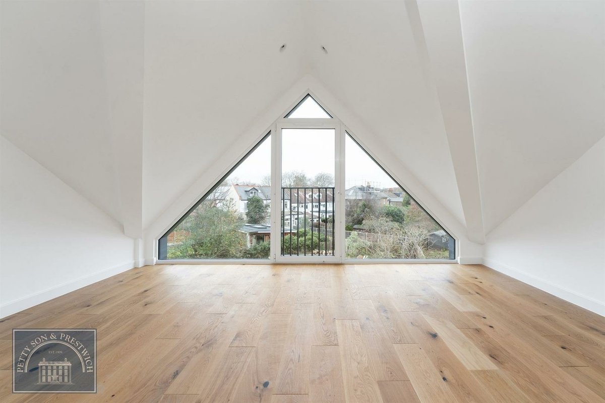The second floor provides two further bedrooms and a sleek, contemporary bathroom, all enhanced by impressive, vaulted ceilings. One of these bedrooms features a Juliette balcony and an eye-catching triangular glass gable wall that frames leafy views across the highly sought-after Aldersbrook area.