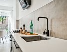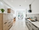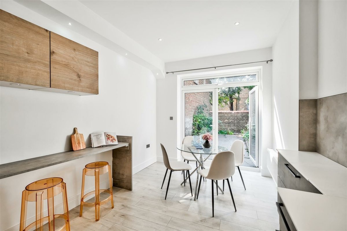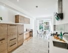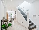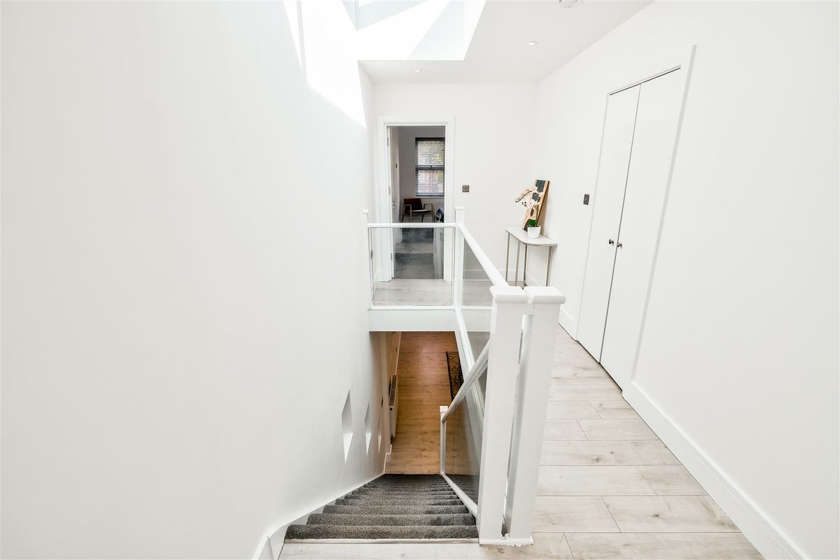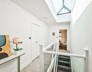Internally the home is bright and spacious, naturally lit by the large sky lantern that hangs above the first floor landing and French doors in the kitchen/dining area. Leading from the lounge at the front there is a wide walkway perfect for a home office desk, convenient gust cloakroom tucked under the stairs and contemporary kitchen/dining room with breakfast area and range of integrated appliances. The double doors from the dining area lead into a private, low-maintenance garden with raised beds and favourable South/Westerly aspect making it the perfect sun-trap until late evening.