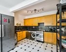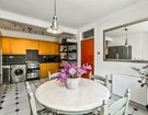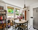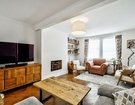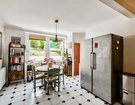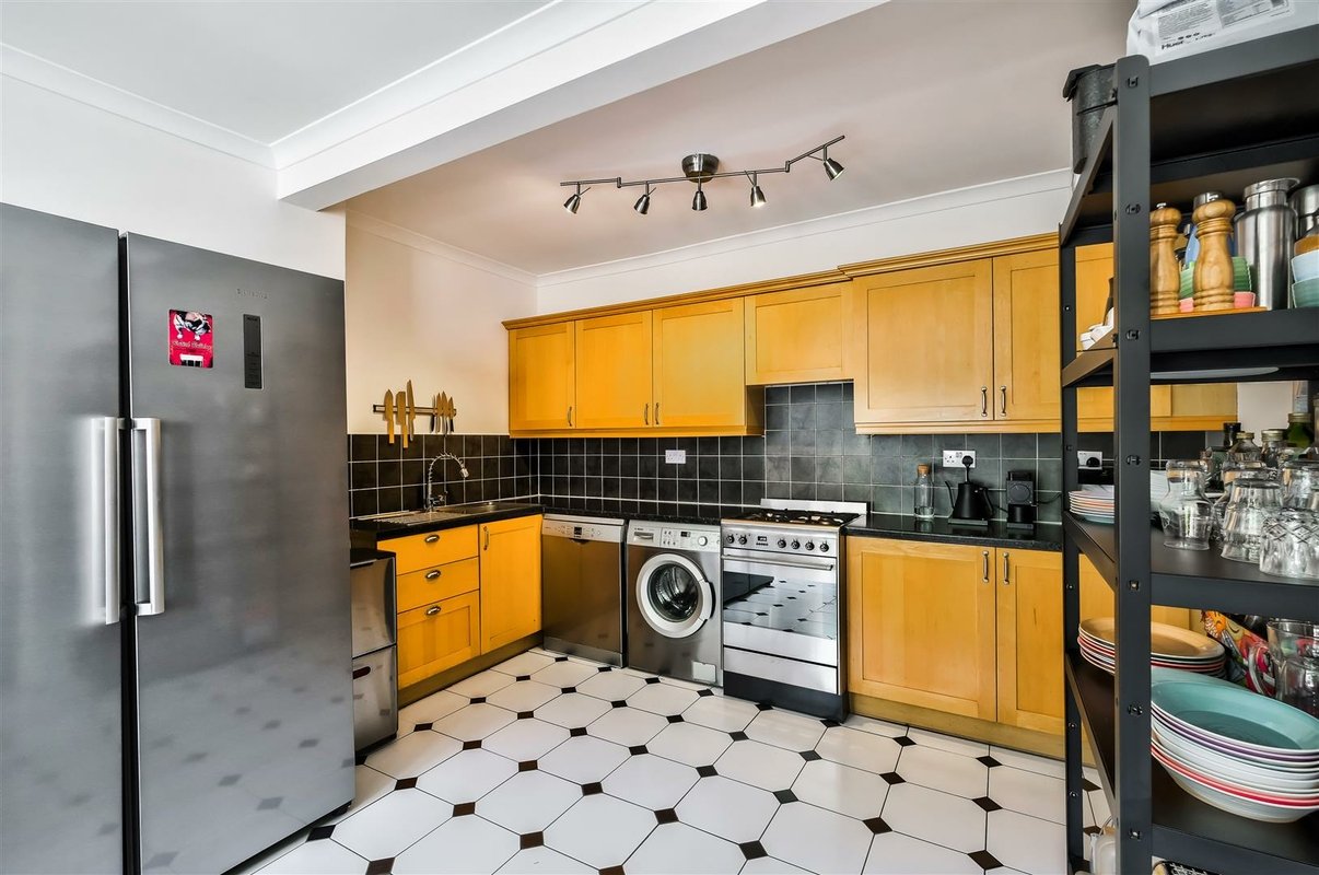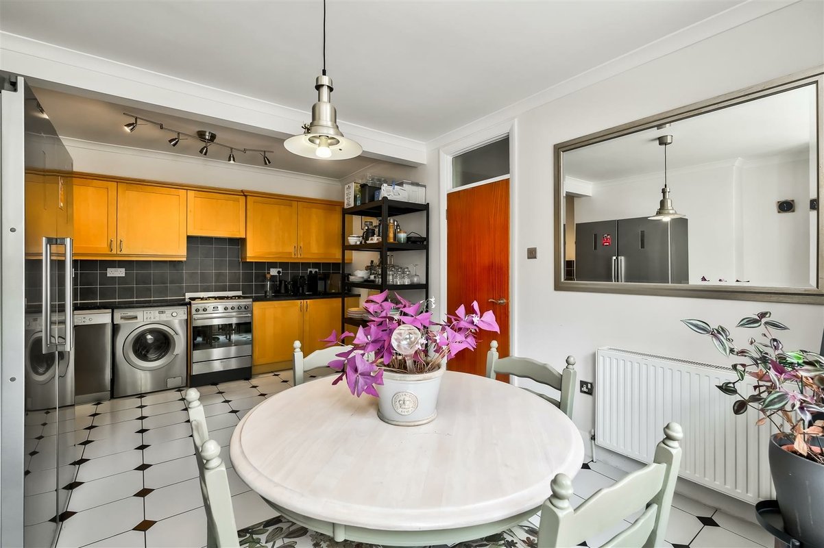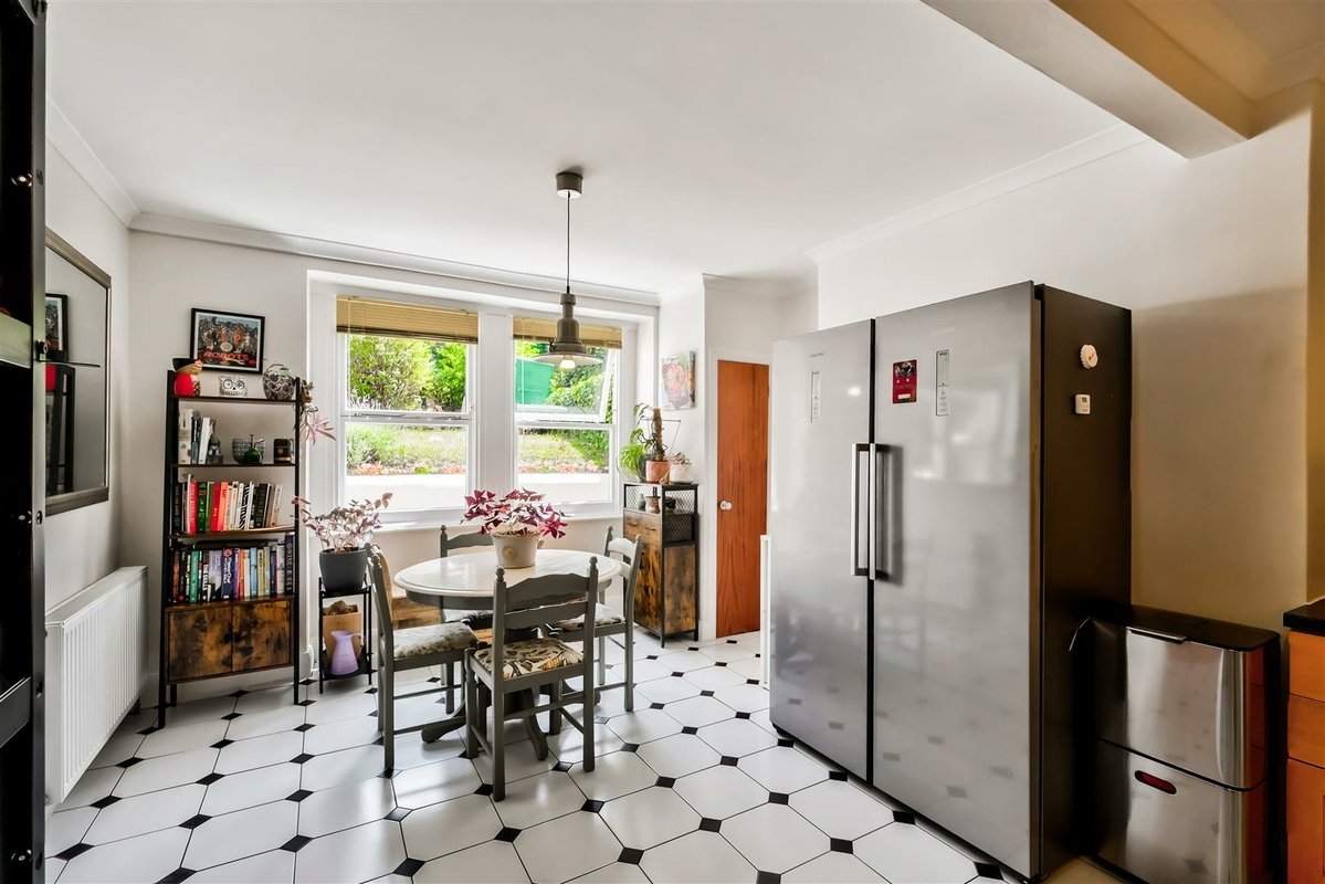 The spacious reception room, complete with period cornicing, serves as the perfect spot to relax or entertain, effortlessly blending classic features with contemporary comfort. The generously sized kitchen features classic wooden cabinetry, black worktops, and tiled flooring. It includes freestanding appliances, including a fridge-freezer, dishwasher, washing machine, and gas cooker. A bright dining area sits by large windows, creating a welcoming and practical space at the heart of the home.