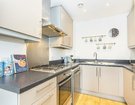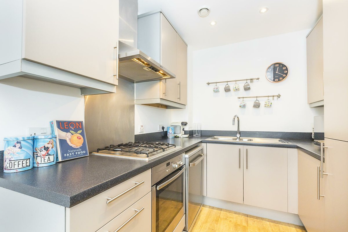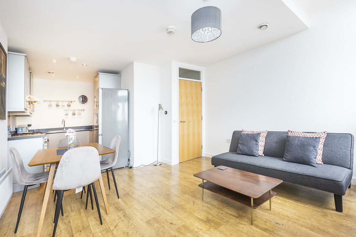 Step into the spacious 250 sq. ft. reception room, where large twin windows fill the space with natural light. Wooden-style laminate flooring and crisp white walls create a fresh, airy atmosphere, while the sleek light grey kitchen, complete with dark grey worktops and excellent storage, is both stylish and practical.