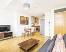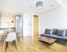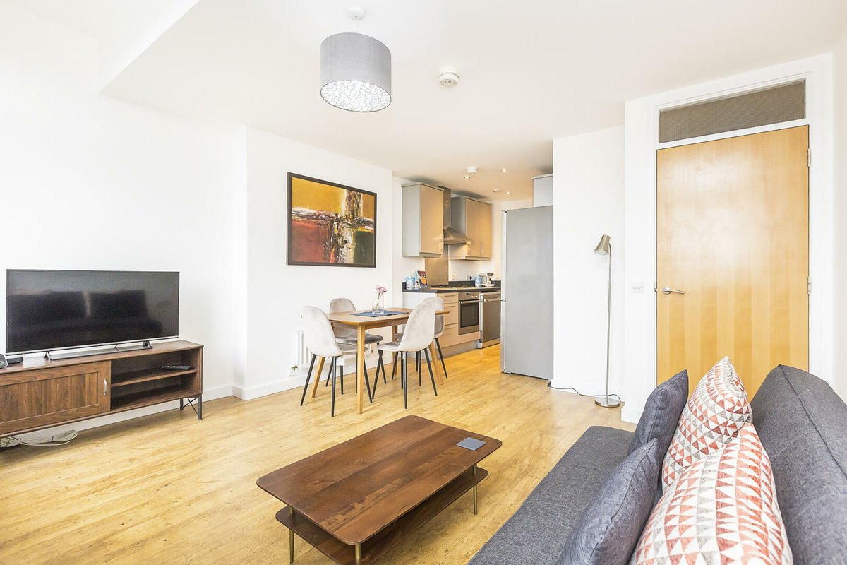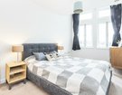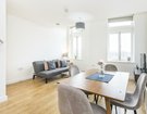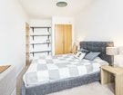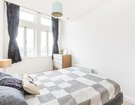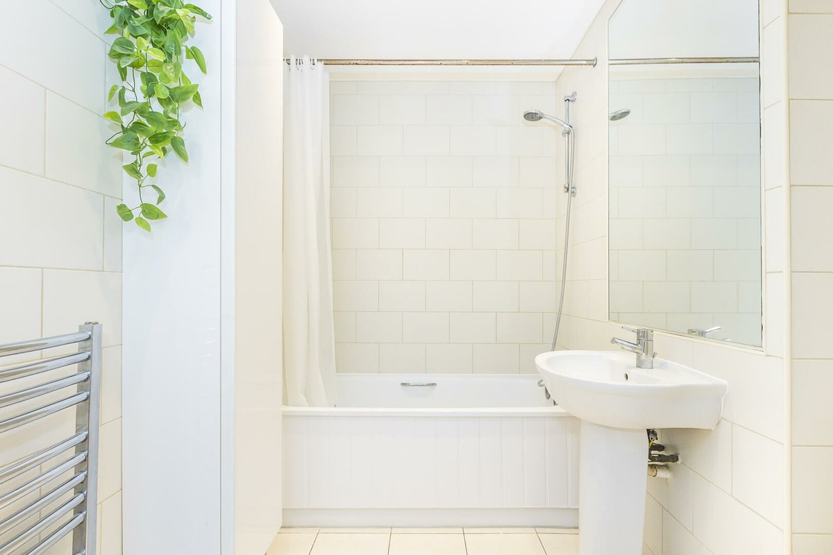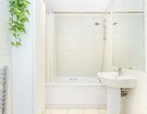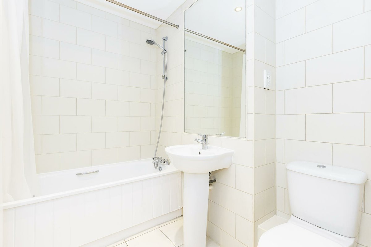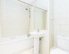 The generous double bedroom features fitted wardrobes, and the chic, fully-tiled bathroom is finished in classic white for a clean, modern feel.