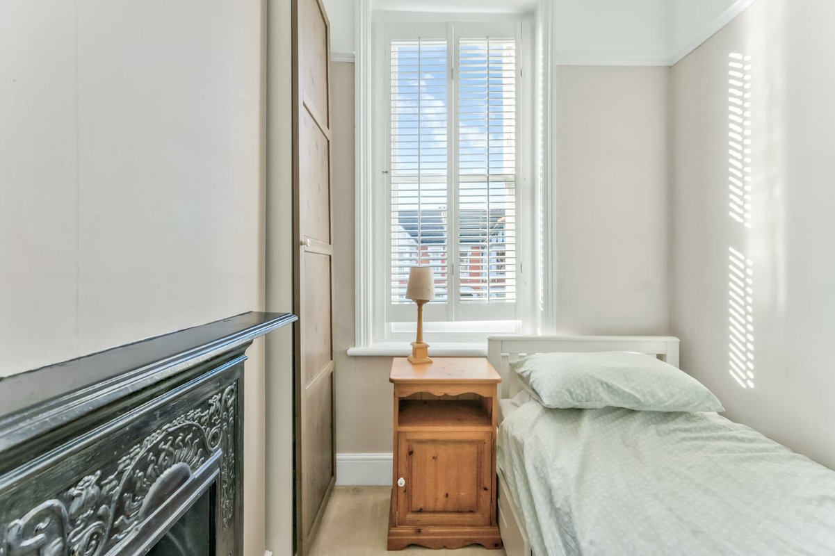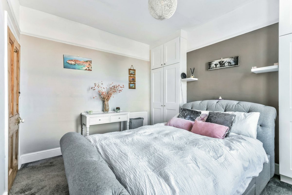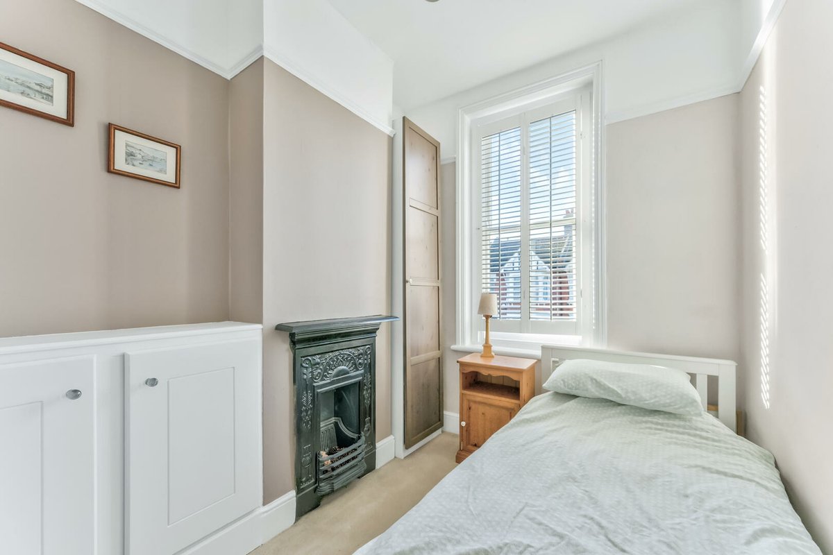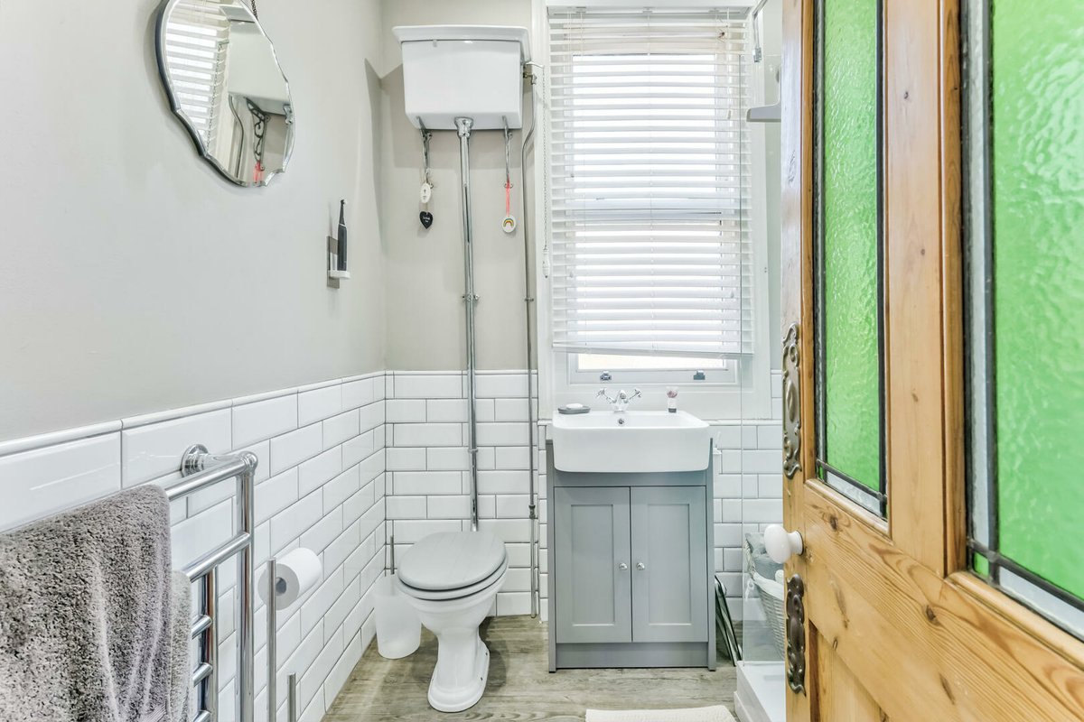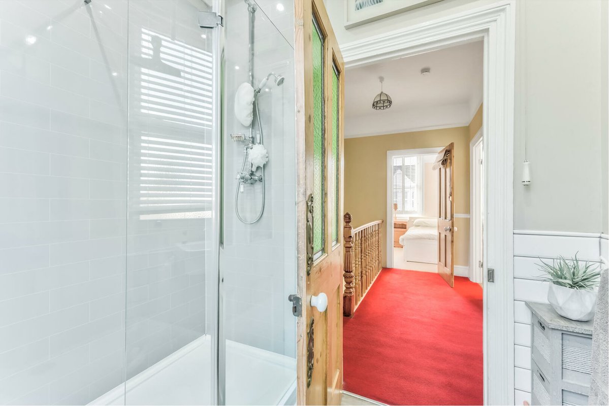 The first-floor hosts two generously sized double bedrooms, each with fitted wardrobes, and delightful original fireplaces. A spacious single bedroom provides additional fitted storage and its own attractive fireplace. The bathroom blends modern comfort with Edwardian elegance, offering stylish white mono-tone tiling, a high-flush traditional toilet, and a walk-in double shower.