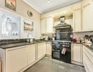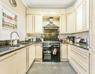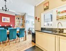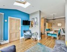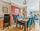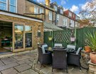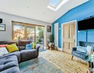 To the rear, the extended second reception area seamlessly opens into a contemporary high-gloss cream kitchen with contrasting black granite worktops and integrated appliances. This space continues into a bright, versatile extension complete with Velux skylights and bi-fold doors leading to the garden. Bathed in natural light, this flexible room is ideal as an additional lounge. Reclaimed floorboards maintain the home’s period charm, while a convenient utility room with WC, washing machine, and dryer space sits just off this area.