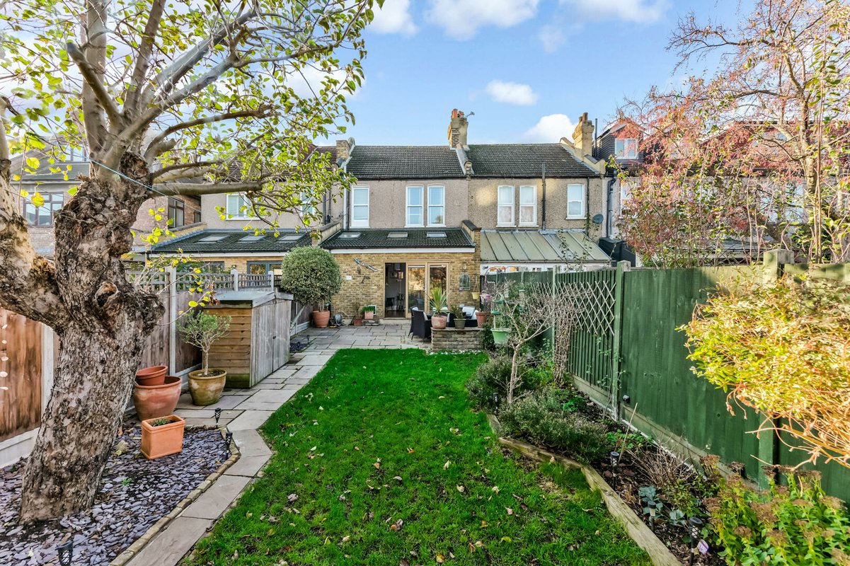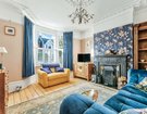 Built circa 1902, the property impresses from the outset with its immaculate façade and striking double-height bay, inset with beautifully crafted double-glazed sash windows. An exquisite stained-glass front door opens onto an original mosaic-tiled pathway and a welcoming entrance hall. The first reception room featuring an ornate fireplace as its focal point, is complemented by original cornicing, large sash windows with plantation shutters, and restored exposed wooden floorboards that flow throughout the home, adding warmth and character.