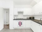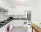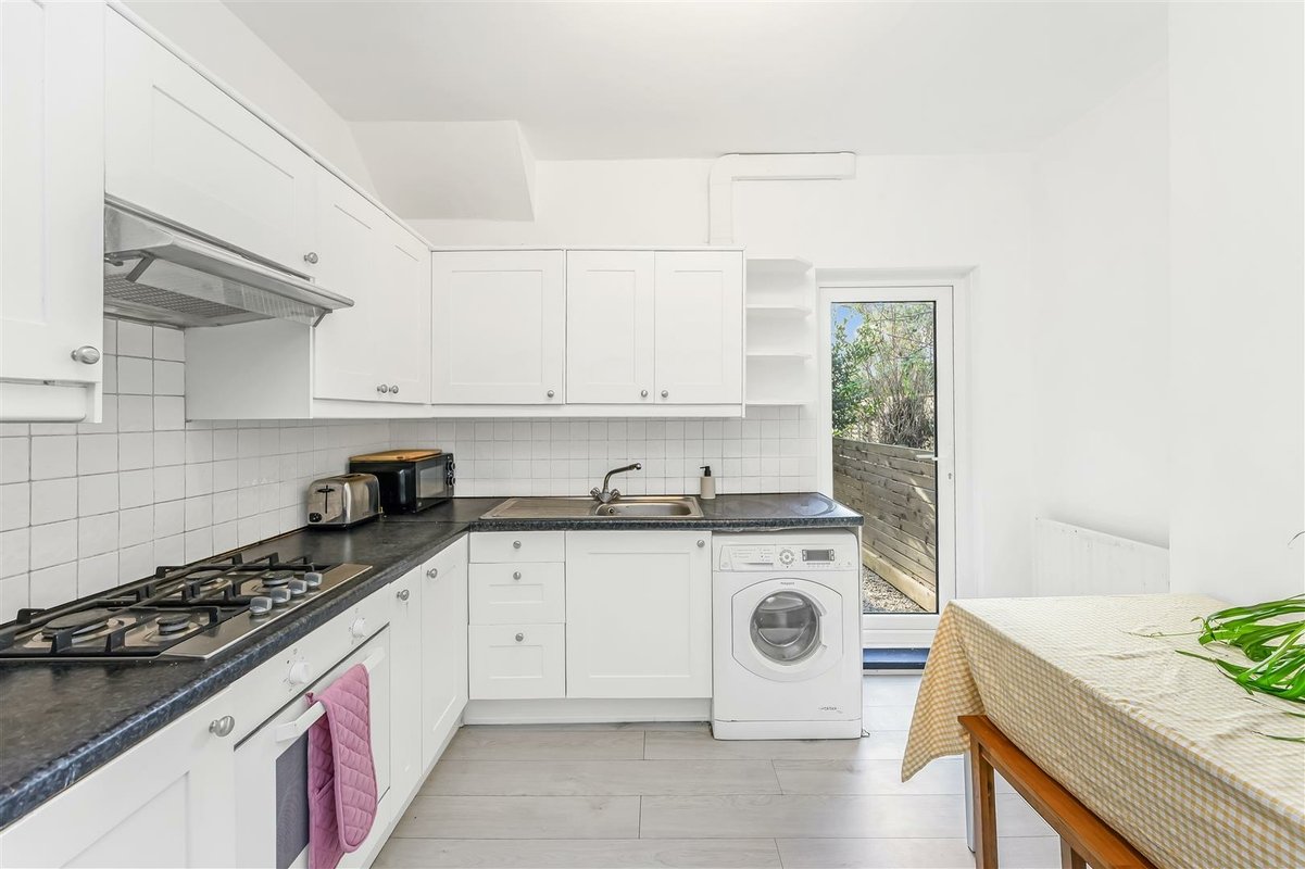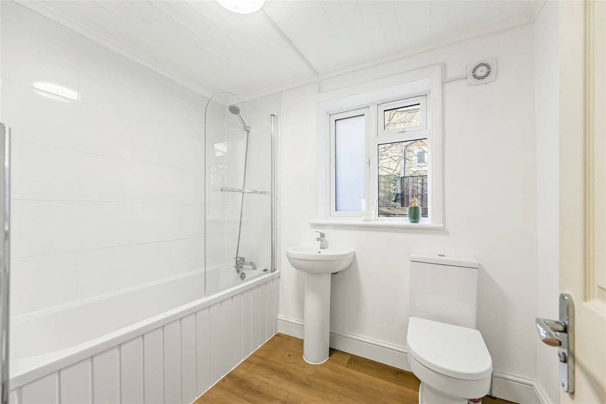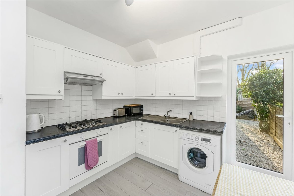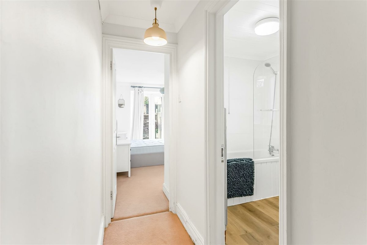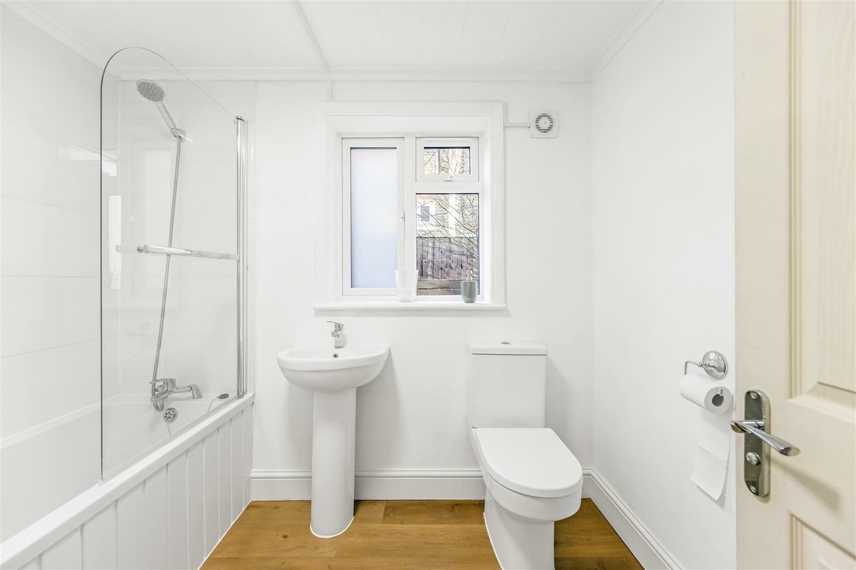 The flat is accessed via a shared front door and communal hallway, with the apartment positioned on the ground floor. Once inside, one of the first rooms you encounter is the spacious kitchen/diner – a sociable space fitted with classic shaker-style units and a glazed door opening directly onto the private garden, which floods the room with natural light. Next door, the recently installed bathroom features a shower over the bath and a window for proper ventilation. To the rear of the flat sits a well-sized double bedroom, complete with French doors that also lead out to the garden.