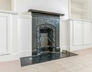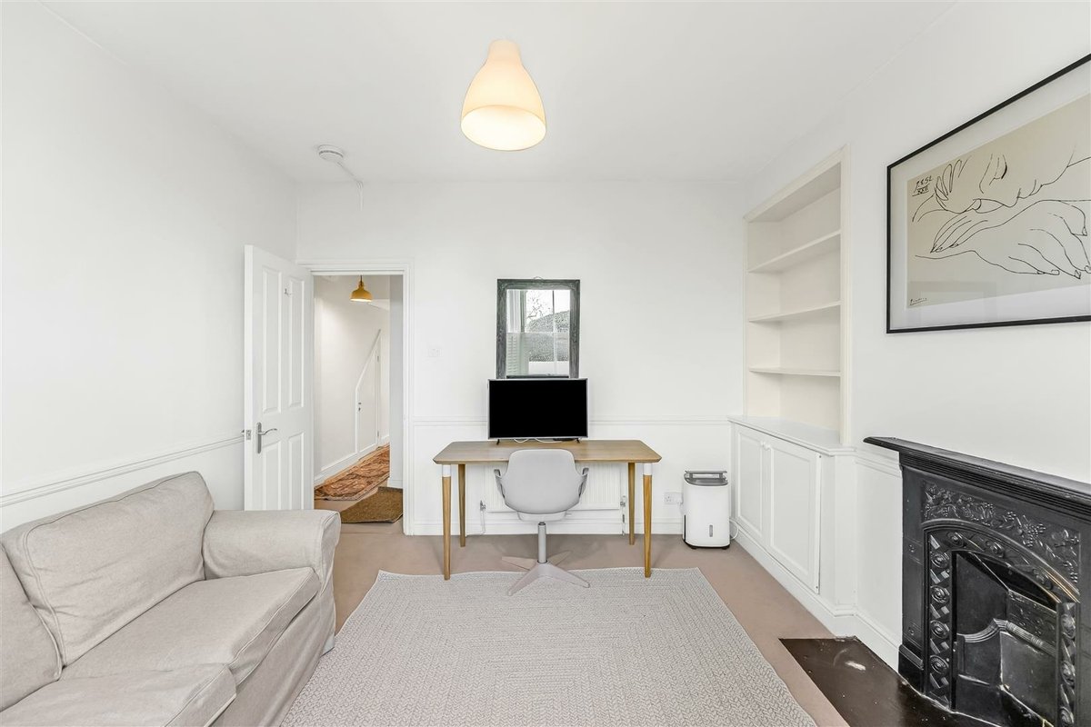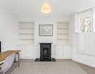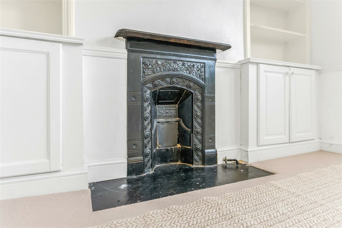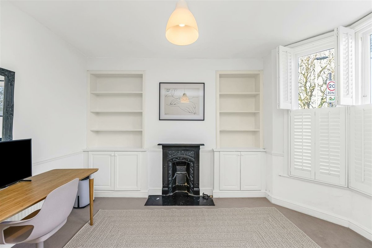 At the front, the bright reception room is finished with a large bay window fitted with plantation shutters, a central fireplace, and bespoke shelving and storage to either side.
