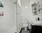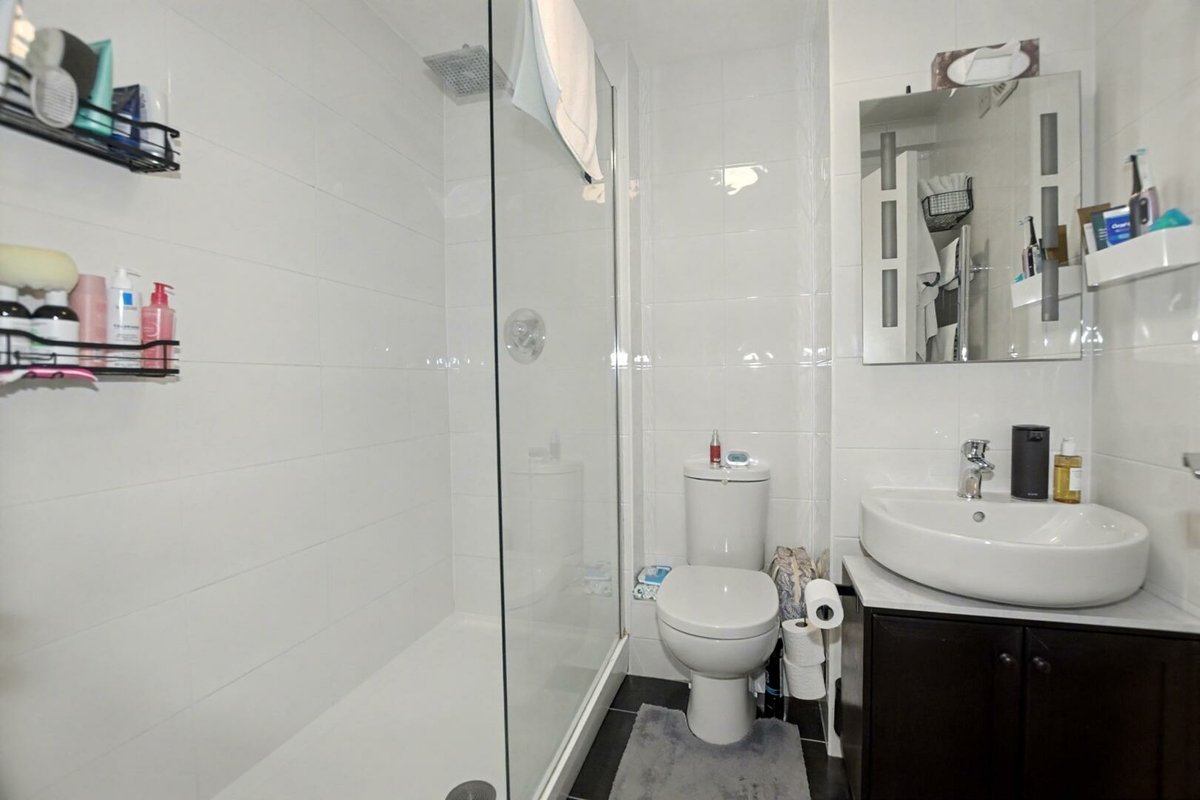 A modern, fully tiled shower room with a large walk-in cubicle and a complimentary white suite completes the accommodation, while a central hallway provides useful built-in storage.