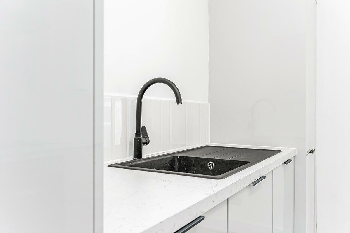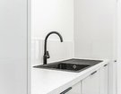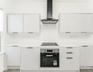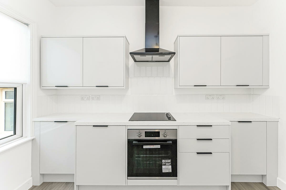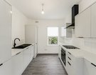The spacious lounge/diner features sleek grey wood-effect flooring and two large windows that flood the room with natural light, creating a bright and airy atmosphere. The accommodation flows seamlessly into the standout kitchen, fitted with high-gloss white units and striking black fittings, offering a contemporary and elegant finish. The large double bedroom enjoys a dual aspect, while the home is completed by a high-spec, modern bathroom finished in fresh white tones.