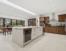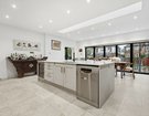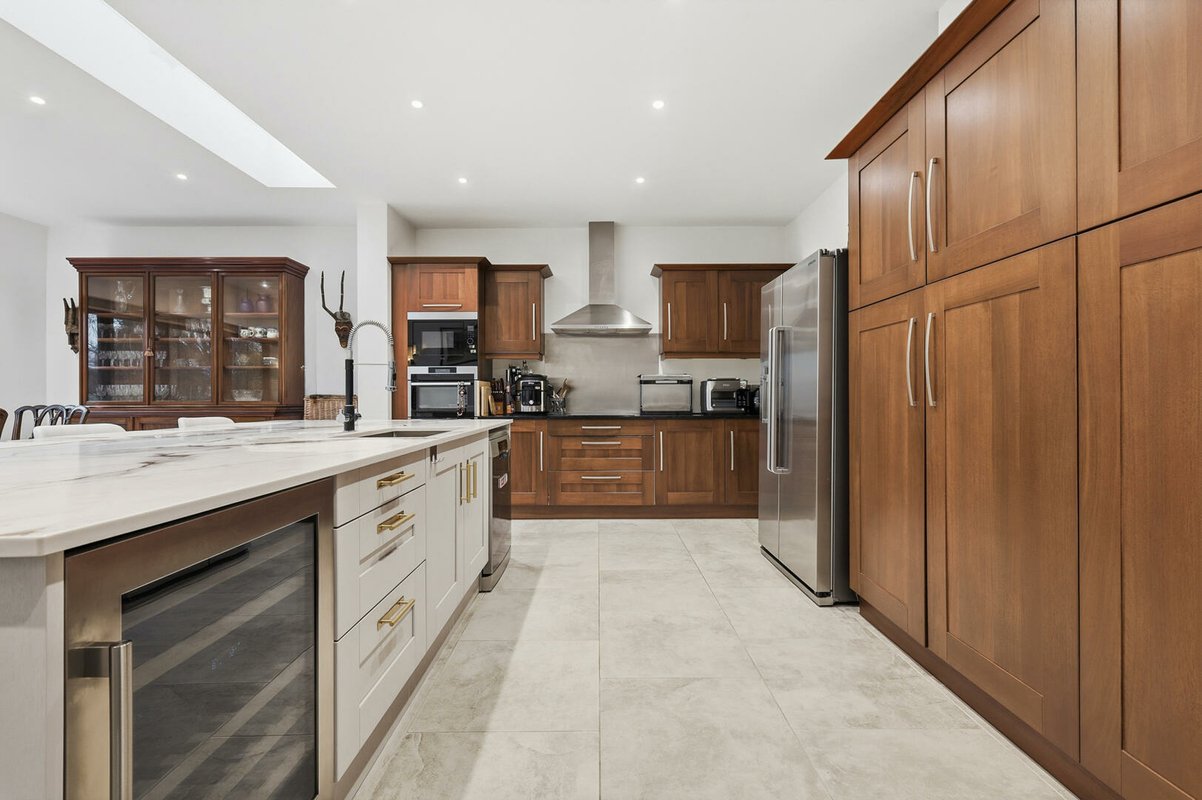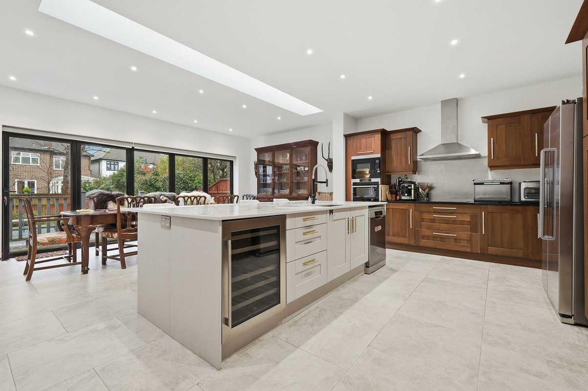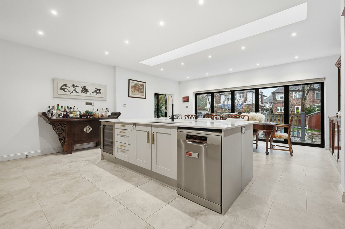 Internally, the house is defined by its generous proportions and high ceilings. Accommodation begins with an entrance porch leading into an equally impressive reception hall, with a home office immediately accessible. The expansive family kitchen/dining room has also been extended to an impressive 20 ft × 21 ft 4 in, creating a highly functional and sociable space at the heart of the home. A recently installed central island forms the focal point of this naturally light-filled room, enhanced by bi-fold doors and a large overhead skylight. The island incorporates storage to both sides, a breakfast bar, dishwasher, drinks fridge, and sink. Surrounding cabinetry comfortably accommodates a large American-style fridge/freezer alongside a range of fitted appliances, while a separate utility room discreetly houses the noisier appliances and provides a secondary sink.