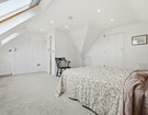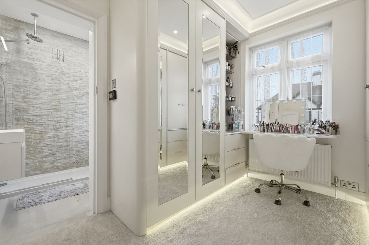 Arranged across the first and second floors are two principal bedroom suites, each offering a generous double bedroom, contemporary en-suite bathroom, and dedicated dressing room. The second principal suite occupies the entirety of the second floor and further benefits from extensive eaves storage. Two additional double bedrooms and an impressive family bathroom, featuring a separate bath and large wet-room-style shower, complete the first-floor accommodation. Further benefits include a large driveway and gated side access to both sides of the property.